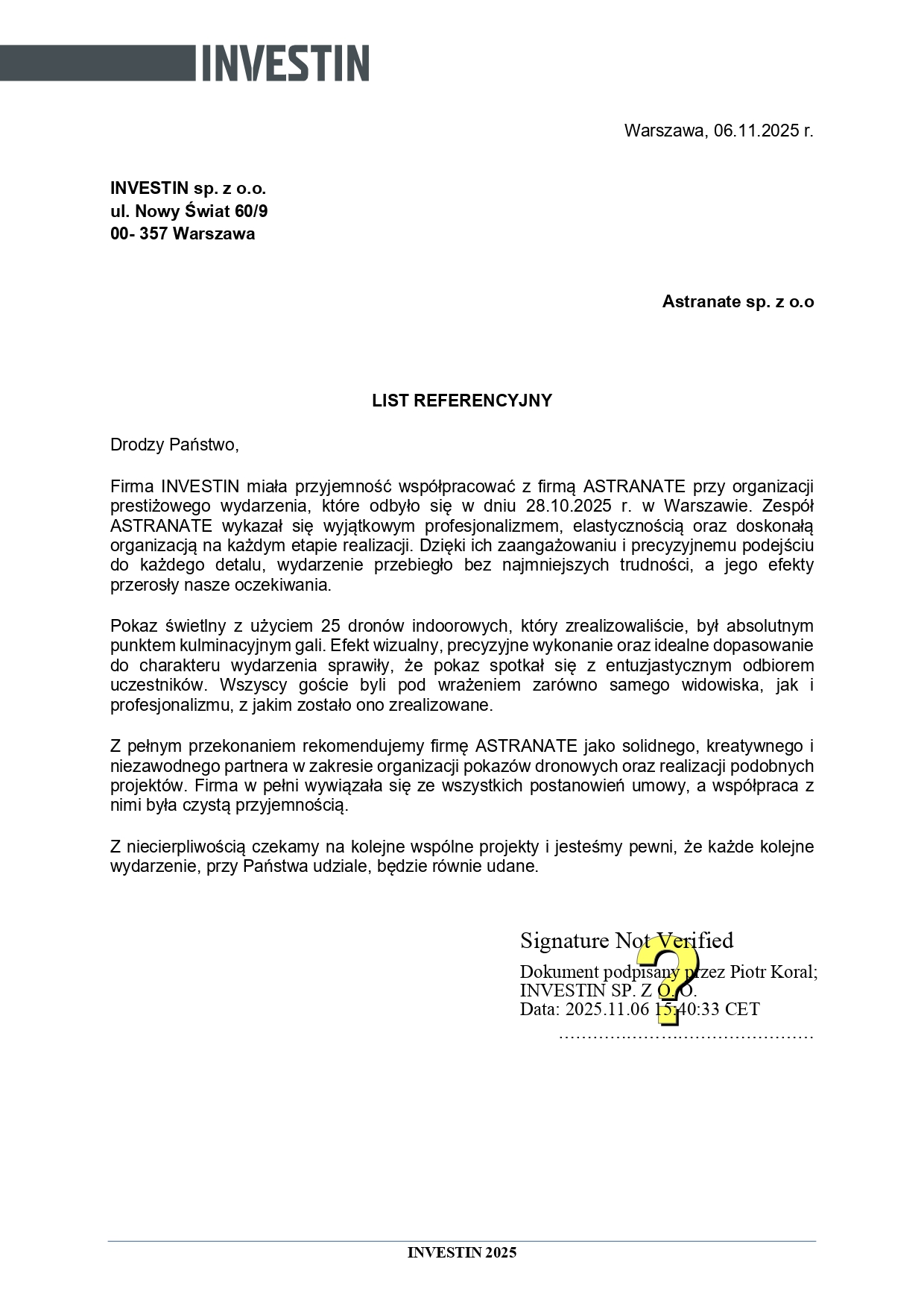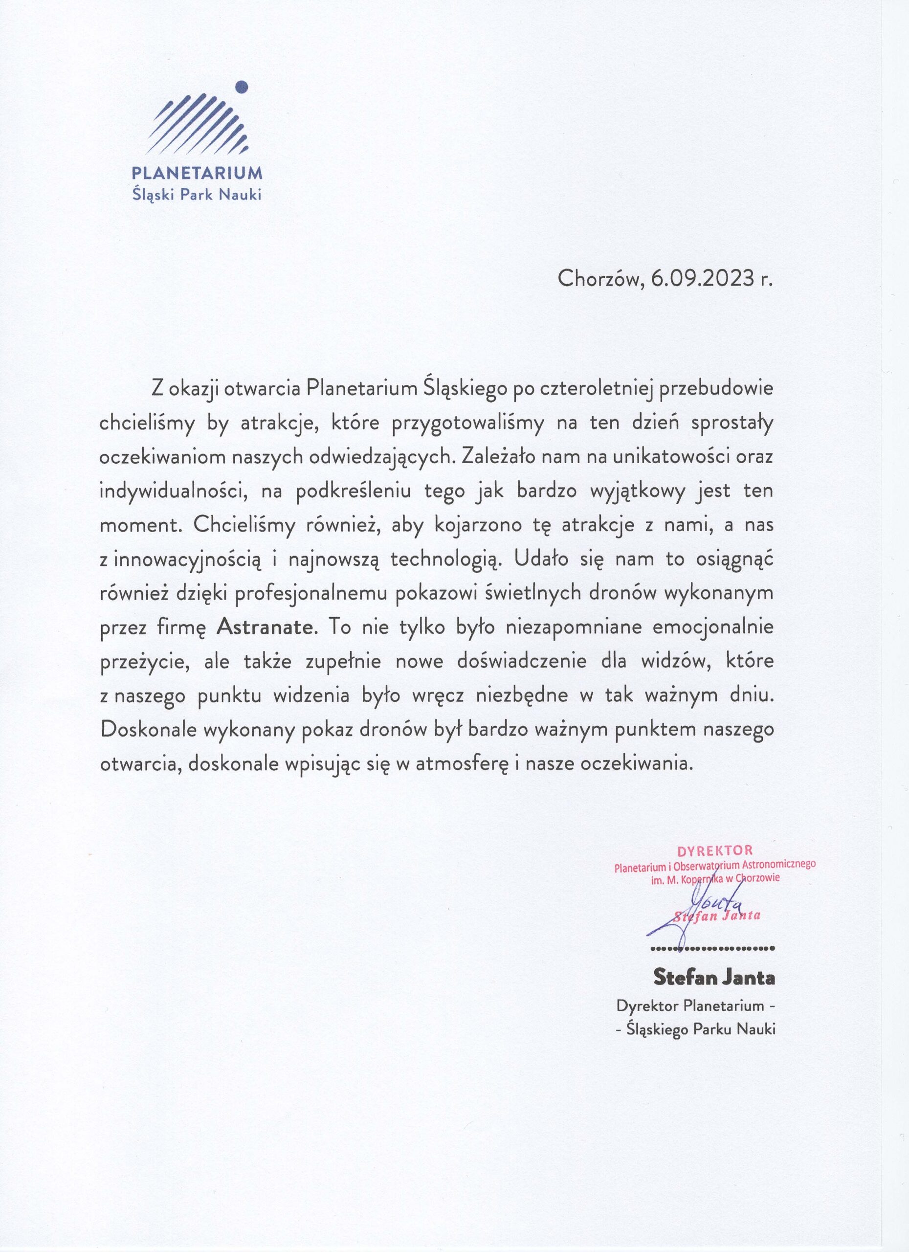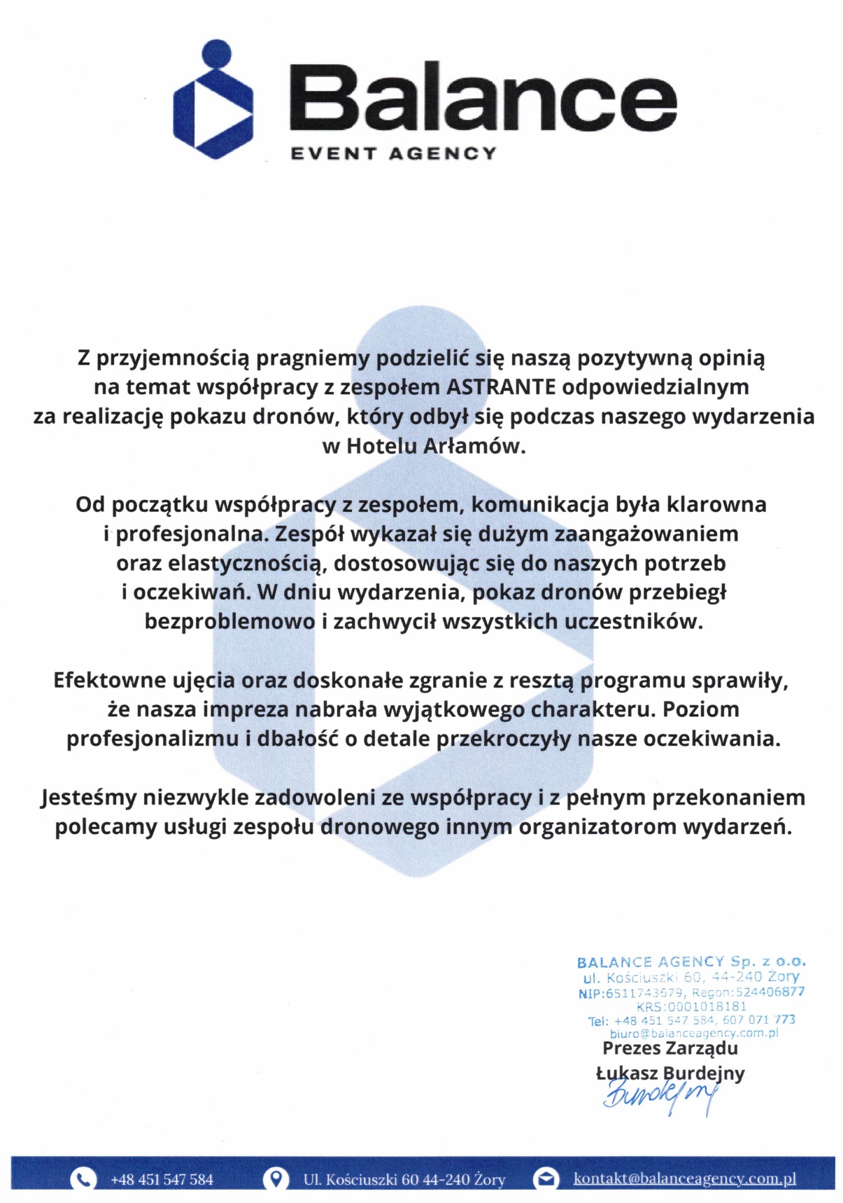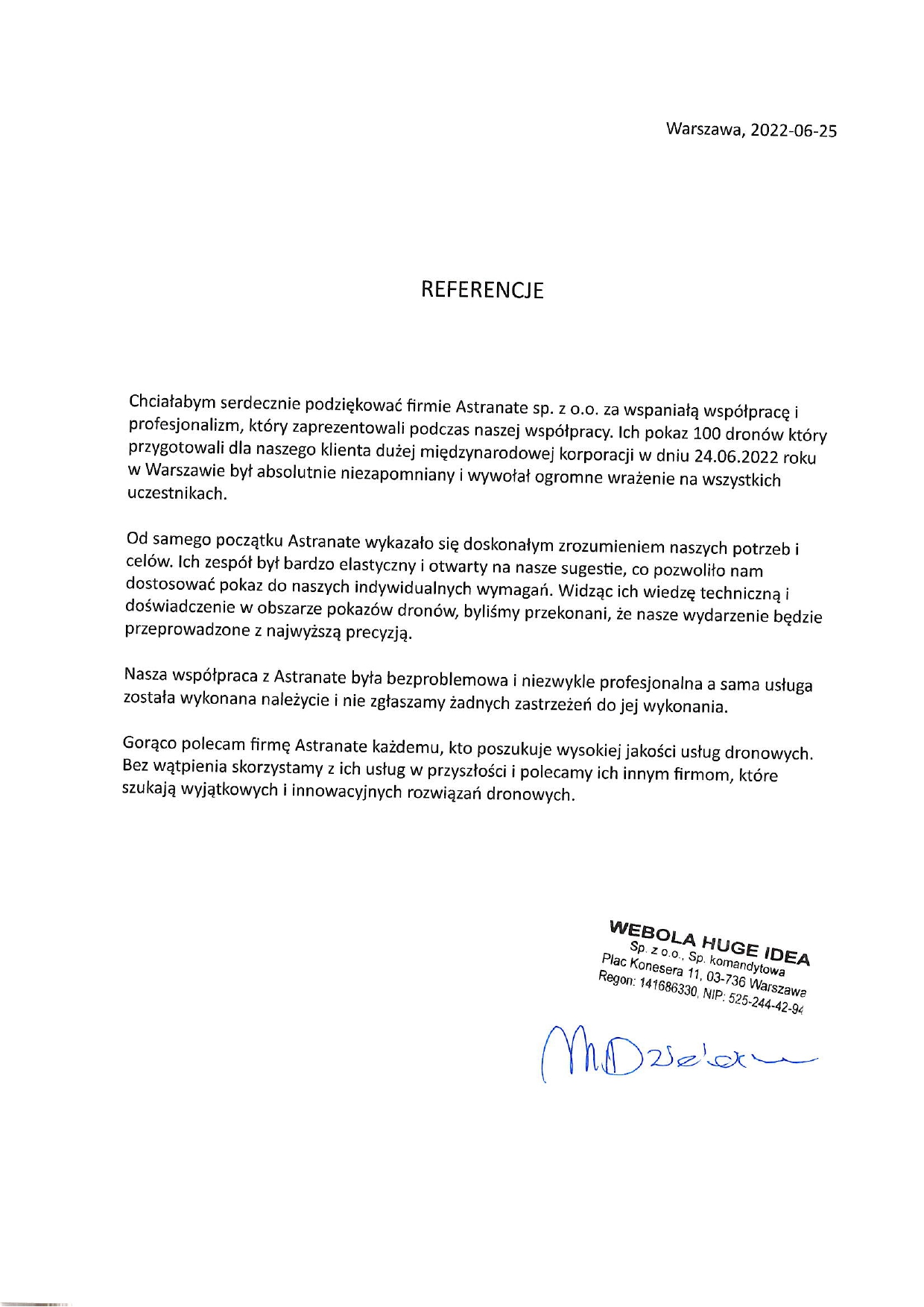 Chciałabym serdecznie podziękować firmie Astranate Sp. z o.o. za wspaniałą współpracę i profesjonalizm, który zaprezentowali podczas naszej współpracy. Ich pokaz 100 dronów, który przygotowali dla naszego klienta dużej międzynarodowej korporacji był absolutnie niezapomniany i wywołał ogromne wrażenie na wszystkich uczestnikach. Od samego początku Astranate wykazało się doskonałym zrozumieniem naszych potrzeb i celów. Ich zespół był bardzo elastyczny i otwarty na nasze sugestie, co pozwoliło nam dostosować pokaz do naszych indywidualnych wymagań. Widząc ich wiedzę techniczną i doświadczenie w obszarze pokazów dronów, byliśmy przekonani, że nasze wydarzenie będzie przeprowadzone z najwyższą precyzją. Nasza współpraca z Astranate była bezproblemowa i niezwykle profesjonalna, a sama usługa została wykonana i nie zgłaszamy żadnych zastrzeżeń do jej wykonania. Gorąco polecam firmę Astranate każdemu, kto poszukuje wysokiej jakości usług dronowych. Bez wątpienia skorzystamy z ich usług w przyszłości i polecamy ich innym firmom, które szukają wyjątkowych i innowacyjnych rozwiązań dronowych.