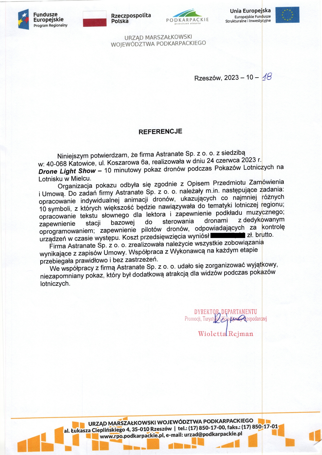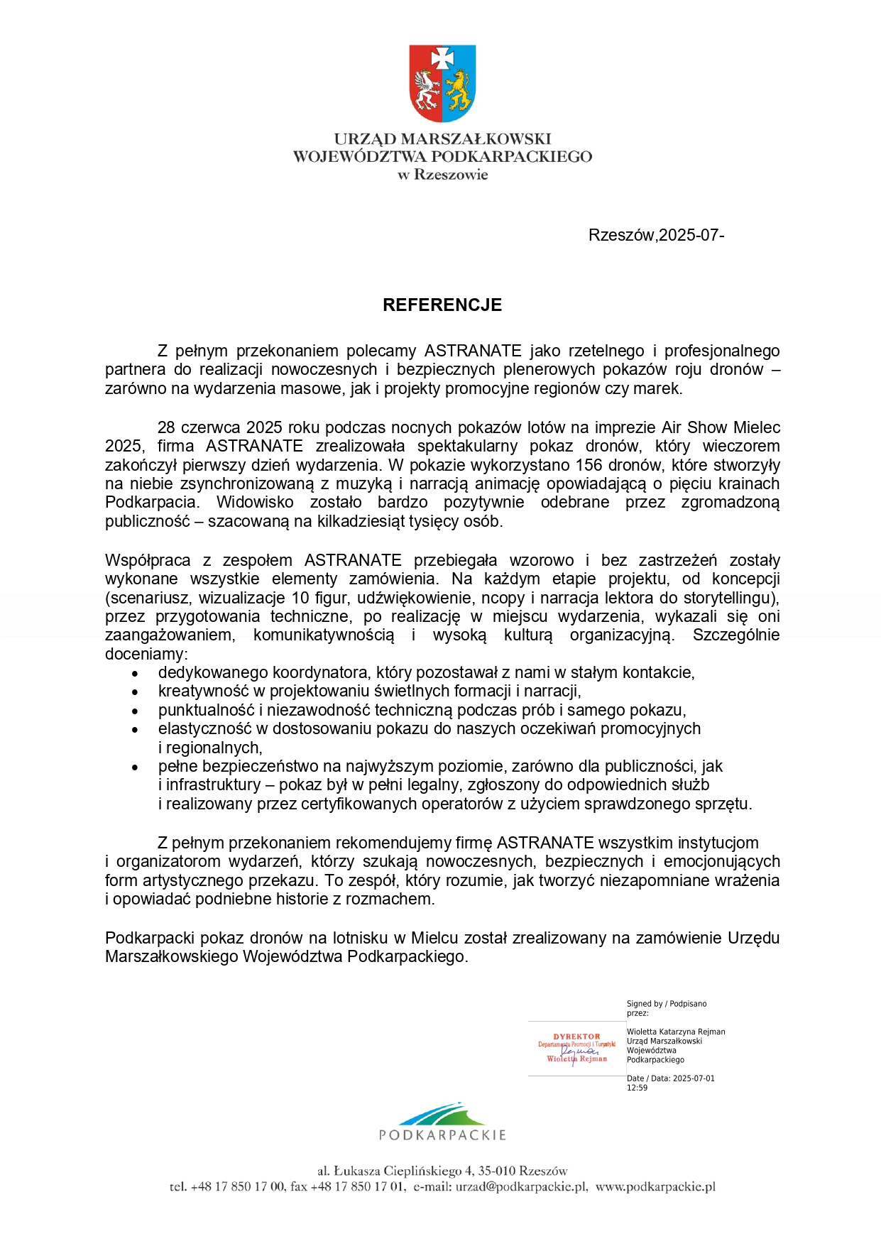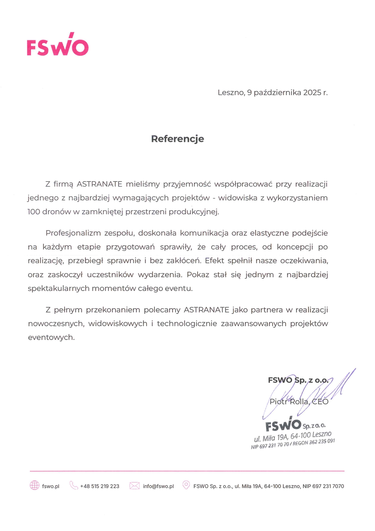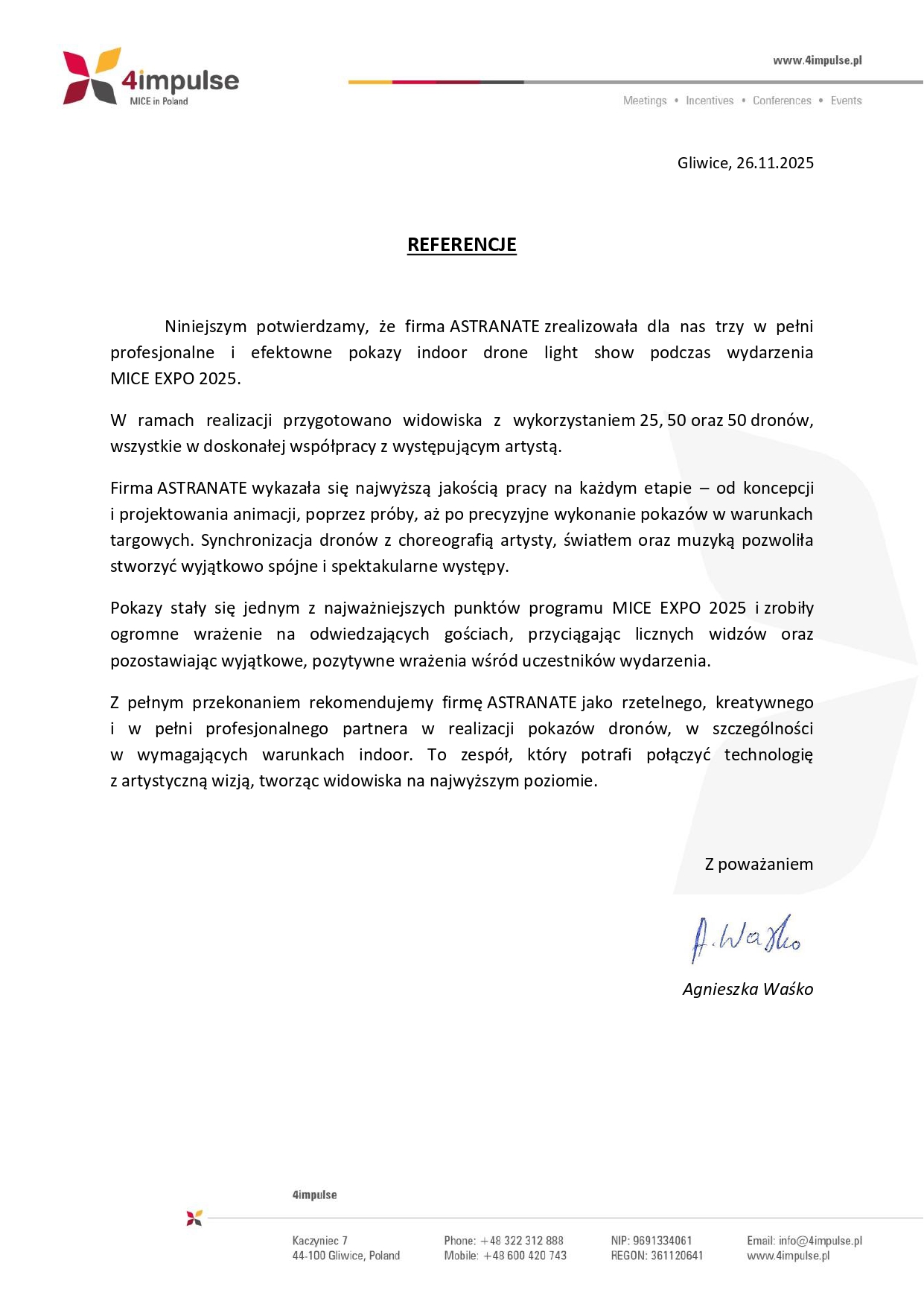 Chciałabym serdecznie podziękować firmie Astranate Sp. z o.o. za wspaniałą współpracę i profesjonalizm, który zaprezentowali podczas naszej współpracy. Ich pokaz 100 dronów, który przygotowali dla naszego klienta dużej międzynarodowej korporacji był absolutnie niezapomniany i wywołał ogromne wrażenie na wszystkich uczestnikach. Od samego początku Astranate wykazało się doskonałym zrozumieniem naszych potrzeb i celów. Ich zespół był bardzo elastyczny i otwarty na nasze sugestie, co pozwoliło nam dostosować pokaz do naszych indywidualnych wymagań. Widząc ich wiedzę techniczną i doświadczenie w obszarze pokazów dronów, byliśmy przekonani, że nasze wydarzenie będzie przeprowadzone z najwyższą precyzją. Nasza współpraca z Astranate była bezproblemowa i niezwykle profesjonalna, a sama usługa została wykonana i nie zgłaszamy żadnych zastrzeżeń do jej wykonania. Gorąco polecam firmę Astranate każdemu, kto poszukuje wysokiej jakości usług dronowych. Bez wątpienia skorzystamy z ich usług w przyszłości i polecamy ich innym firmom, które szukają wyjątkowych i innowacyjnych rozwiązań dronowych.